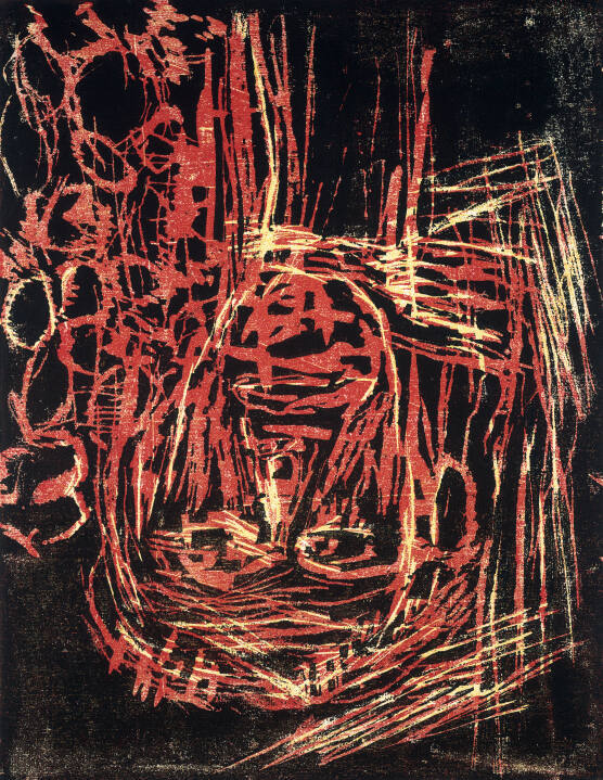 DescriptionThis painting depicts a human head rendered upside down in red and pale yellow marks on a black background.Gallery LabelIn Head (Kopf), Georg Baselitz depicts his classic motif—the upside-down head—in vivid red and yellow against a black background. This intentionally raw and roughly carved woodcut expresses the elemental anguish of human existence. The inverted head seems caught in the turmoil of an upside-down world. Head further serves as a metaphor for Germany, at that time a country divided against itself and wrestling with the need to address its rich yet deeply troubled past.