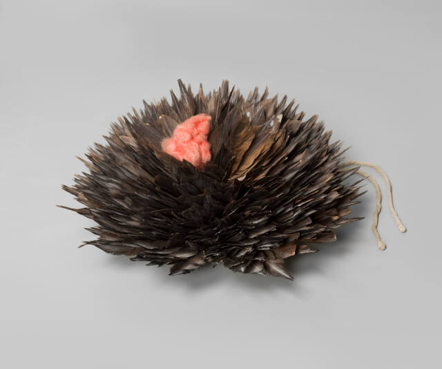 DescriptionCircular shaped headdress made from flicker feathers topped with a puff of red colored wool.Gallery LabelThe Pomo peoples' rich ceremonial life is embodied in this delicate, intricately constructed feather headdress, one of several elaborate types created within central and northern California cultures. The blossom-like cluster of feathers was attached to a wooden hoop, which was secured to the back of a man's head by inserting a wooden pin into a hair net. The headdress was probably worn in ceremonies celebrating first fruits and harvests or in rituals enacted to prevent death.