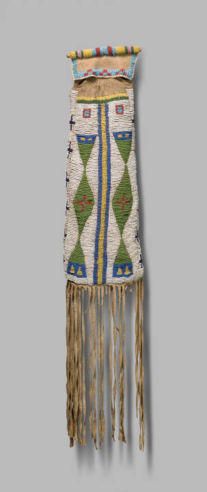 DescriptionNarrow beaded and fringed bag with flap closure at the top; geometric beaded designs in white, green, blue, yellow and red.