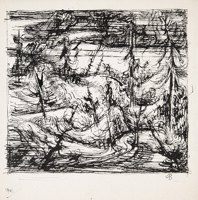 DescriptionThe surface of this small, square ink drawing is highly animated. Black lines of varying weights suggest pine trees. Some of these trees grow straight, while others lean to the left and right, creating a dynamic rhythm across the surface of the cream-colored sheet. The lines that describe the ground from which this stand of pines grows evoke an undulating sensation—a landscape in motion. What may be a faint suggestion of a horizon line extends across the composition from edge to edge approximately one-quarter of the way down from its top edge. Densely drawn, generally horizontal parallel lines in this upper register suggest dark sky, while the areas devoid of lines suggest clouds. The artist’s monogram, a conjoined “AB” appears just below the lower right corner of the drawing. The year the drawing was made, 1941, is written in the lower left corner of the margin of the sheet.Copyright© Albert Bloch Foundation