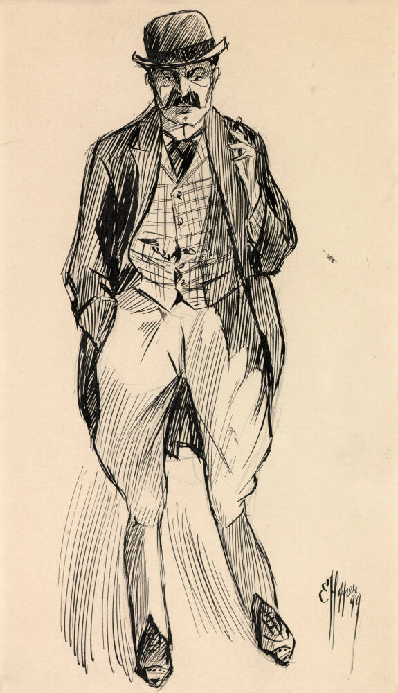 DescriptionThis small ink and pencil on paperboard drawing is a full-length depiction of a dapper turn-of-the-century gentleman. The mustachioed man, who fills the page top to bottom, scowls slightly as he faces forward with his weight over his proper right foot. His proper right hand is in his pants' pocket, while his proper left hand holds a cigar or cigarette raised to the level of his shoulder. He wears a bowler hat, the brim of which shades his eyes. He is smartly dressed in a wide, dark cravat, plaid vest, dark jacket with tails that nearly reach the back of his knees, light jodhpur-style pants, and wing-tip shoes. Long vertical lines running from the man's knees to his feet suggest the possibility of movement. The artist's signature (which also features elongated strokes of the pen, particularly for the letter "H") is prominent in the lower right corner of the composition, along with the date: "99." The same subject is rendered on the verso in pencil.Copyright© Heirs of Josephine N. Hopper / Licensed by Artists Rights Society (ARS), NY