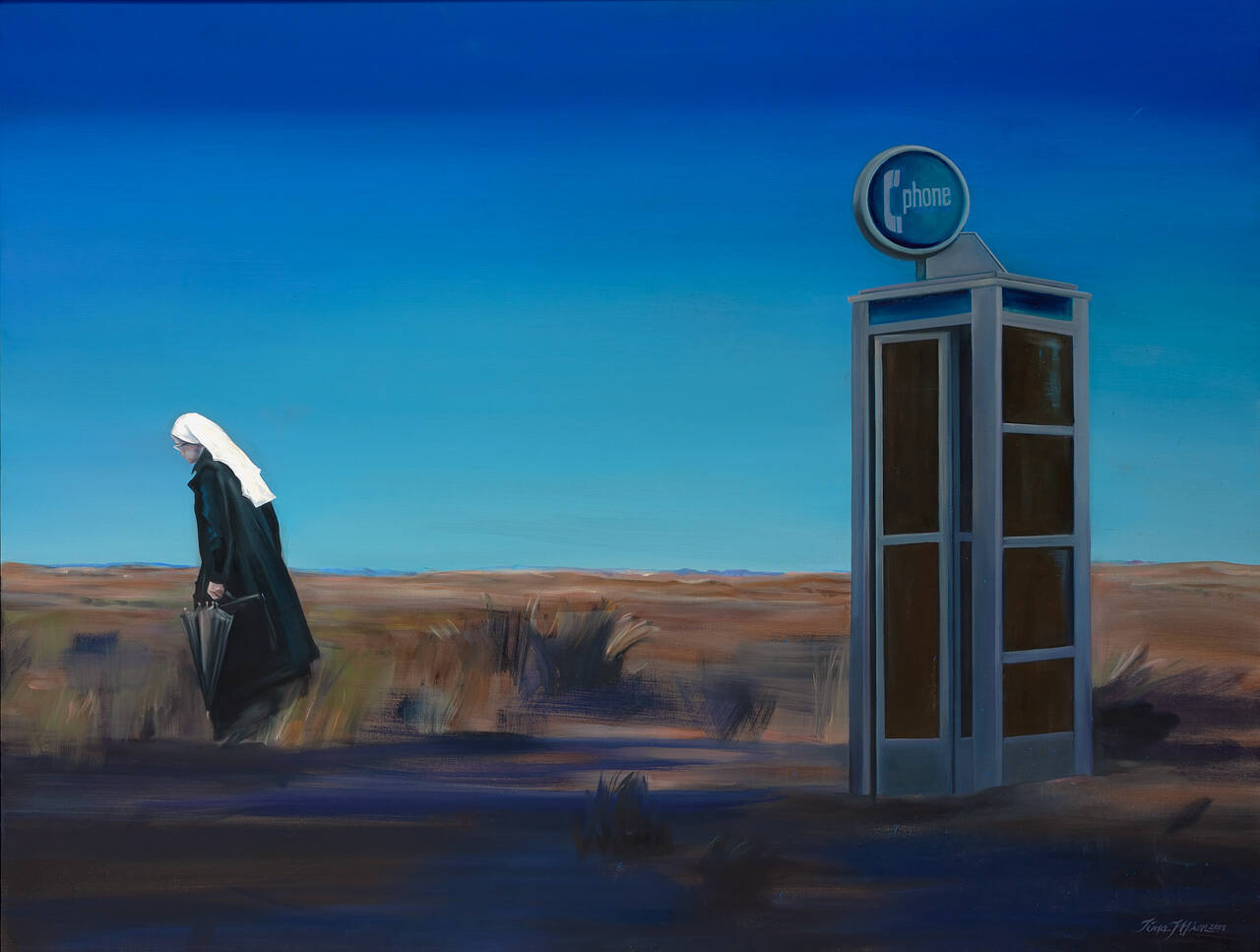 DescriptionThis painting depicts a nun in a habit at the left of the canvas who is walking away from a phone booth on the right. The setting is desolate and appears to be a desert. The horizon line is low and over half of the upper part of the painting is deep, blue sky.Copyright© Edward Ruscha