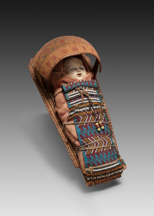 DescriptionToy basketry cradle with visor containing commercial American doll wrapped in pink blanket and adorned with beaded panel.Published ReferencesTorrence, Gaylord, ed. Continuum: North American Native Art at the Nelson-Atkins Museum of Art. Kansas City: Nelson-Atkins Museum of Art.