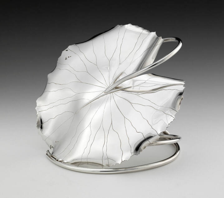 DescriptionMade of sterling silver, the Rattle is composed of two water lily leaves joined front-to-back with a twisting wire that acts as both a stand and a handle. The water lily leaf on the back is smaller than the front leaf. A maker's mark is impressed on the underside of the stem of the smaller leaf: © Robyn Nichols (in script) and another stamp STERLING (all caps). The interior space created by the leaves, which are engraved and pierced to suggest the aging of the leaves, encloses several pieces of steel shots that make a ringing or clattering sound when the piece is moved.Gallery LabelRobyn Nichols is well-known for her intricate representations of nature made in precious materials. In Nymphaea Rattle, Nichols has recreated two water lily pads in silver. Between the two leaves are several pieces of steel shot, which create metallic sounds when the rattle is shaken. This element gives the work a unique sensory dimension. Candelabrum presents an intertwined arrangement of lupine and lady slippers to form a single candle holder. Nichols is a self-taught metalsmith, although she graduated from the Kansas City Art Institute Design department.