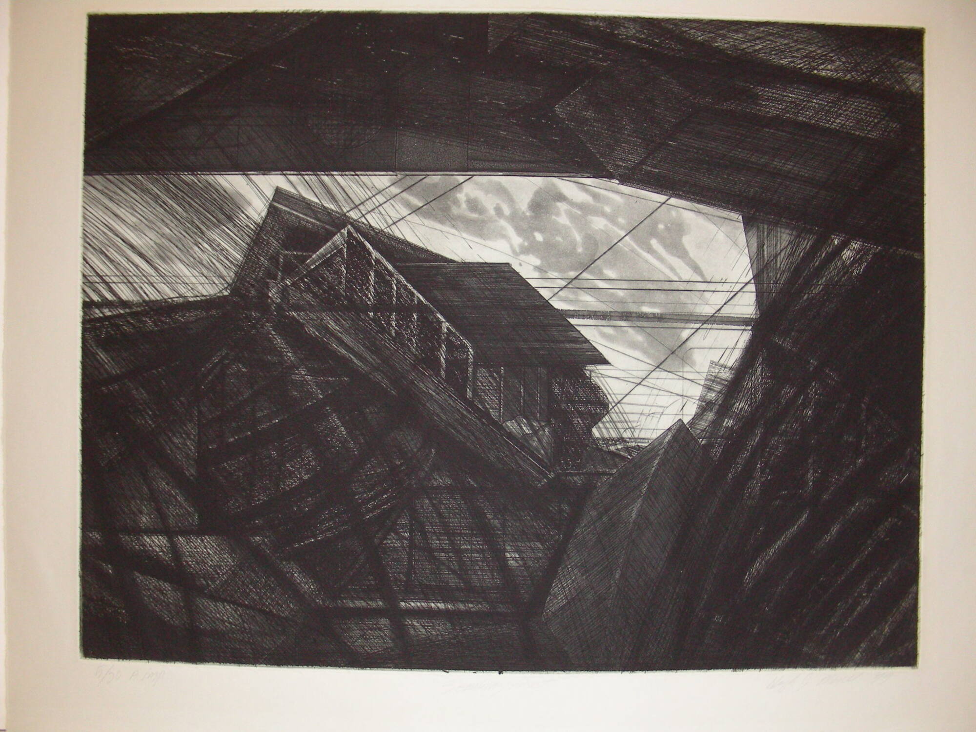 DescriptionThis etching of black ink on grey paper depicts an abstract image constructed of hard-edge linear forms made up of lines drawn very closely together. At the center is a shape that recalls an architectural structure with a peaked roofline set within an ambiguous landscape. The architectural structure is surrounded by a light area and also dark linear forms. One appears to look at the architectural motif from below and within a structure beneath the ground.Copyright© Hugh J. Merrill
