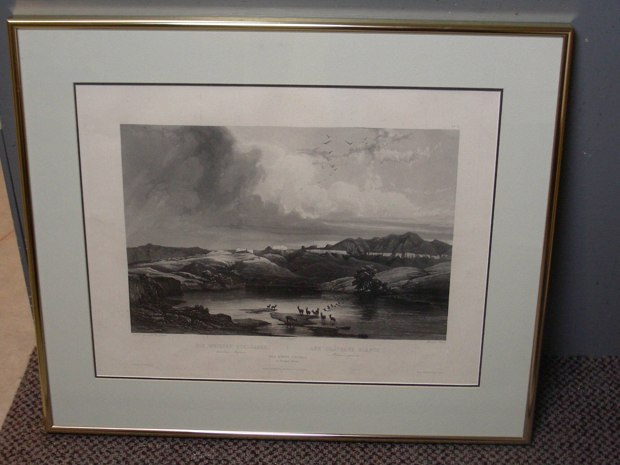 DescriptionThis uncolored engraving is printed with black ink on white paper. It depicts a detailed view of a calm stretch of the Missouri River. The "white castles" of the title are the unusual rock formations silhouetted against the sky in the background. While a flock of birds soar in a cloud-filled sky just right of center, a herd of antelope swim from the far bank of the river in the middleground to the sandbars and shallower waters in the foreground. "Tab. 37" is printed above the top right corner of the engraving. Multiple other printed inscriptions appear below the scene. Directly below the lower left corner of the image: "Defsine [sic] d'ap, nat. par Ch Bodmer." Directly below the lower edge of the image, center: "Imp. de Bougeard." Directly below the lower right corner or the image: "Gravé par Himley." Beneath these inscriptions, the title of the engraving is written in three languages, German, English, and French (left to right): "DIE WEISSEN SCHLÖSSER. / am obern Mifsouri [sic]" "THE WHITE CASTELS [sic] / on the upper Missouri." "LES CHÂTEAUX BLANCS. / Mifsouri [sic] supéreur." Additional inscriptions appear near the lower edge of the sheet (left to right): "Coblenz, bei J. Hölscher" "London, published by Ackermann & Co. Strand." "Paris, Arthurs Bertrand. éditeur." Beneath the central inscription there is a blind stamp (embossing) that reads "C. Bodmer / Direct." The embossing is not very heavy. Therefore, the blind stamp is difficult to read without additional illumination.