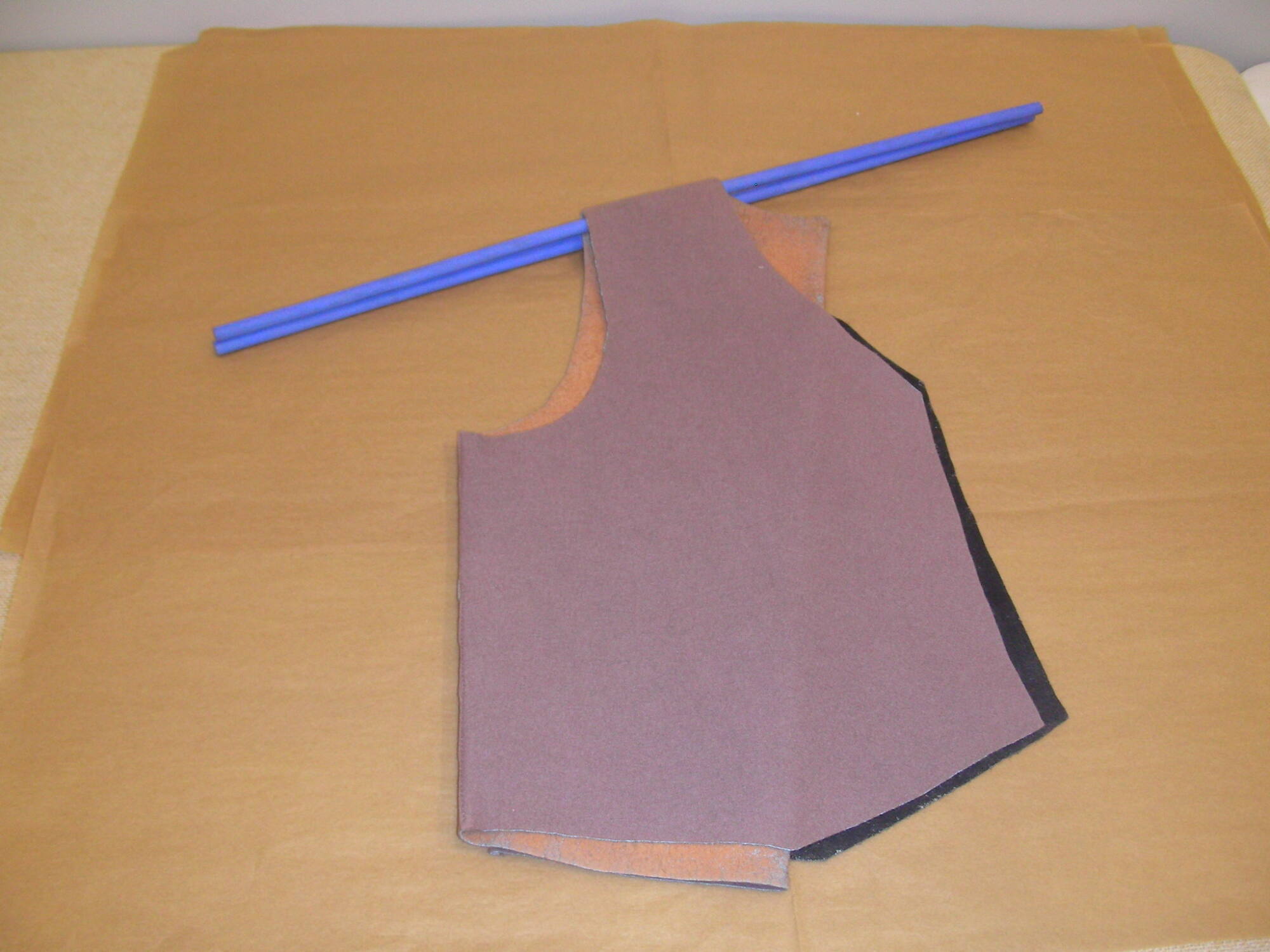 DescriptionThis taupe, cut-felt sculpture takes the form of a folded man's vest hung from two diagonal blue dowels.A=Vest