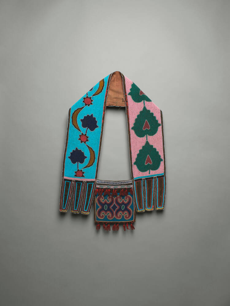 DescriptionShoulder bag composed of pouch and wide strap ornamented with tiny glass beads in blues, pinks, red and black.Published ReferencesTorrence, Gaylord, ed. Continuum: North American Native Art at the Nelson-Atkins Museum of Art. Kansas City: Nelson-Atkins Museum of Art.