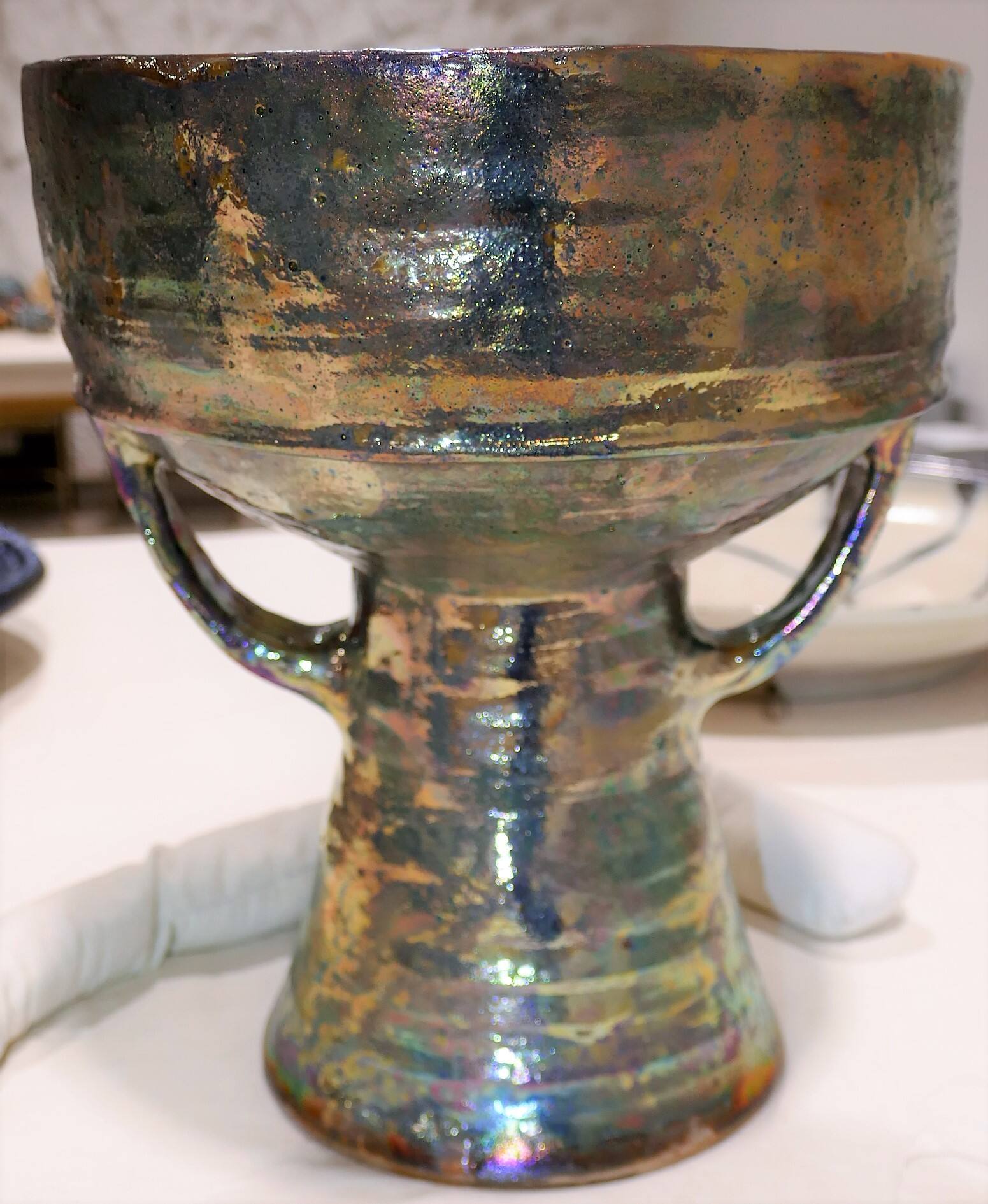 DescriptionA oversized chalice-shaped vessel supported on a slightly tapering, cylindrical foot made of reddish earthenware with an purplish-green-speckled lustre glaze.Copyright© Estate of Beatrice Wood / The Beatrice Wood Center for the Arts