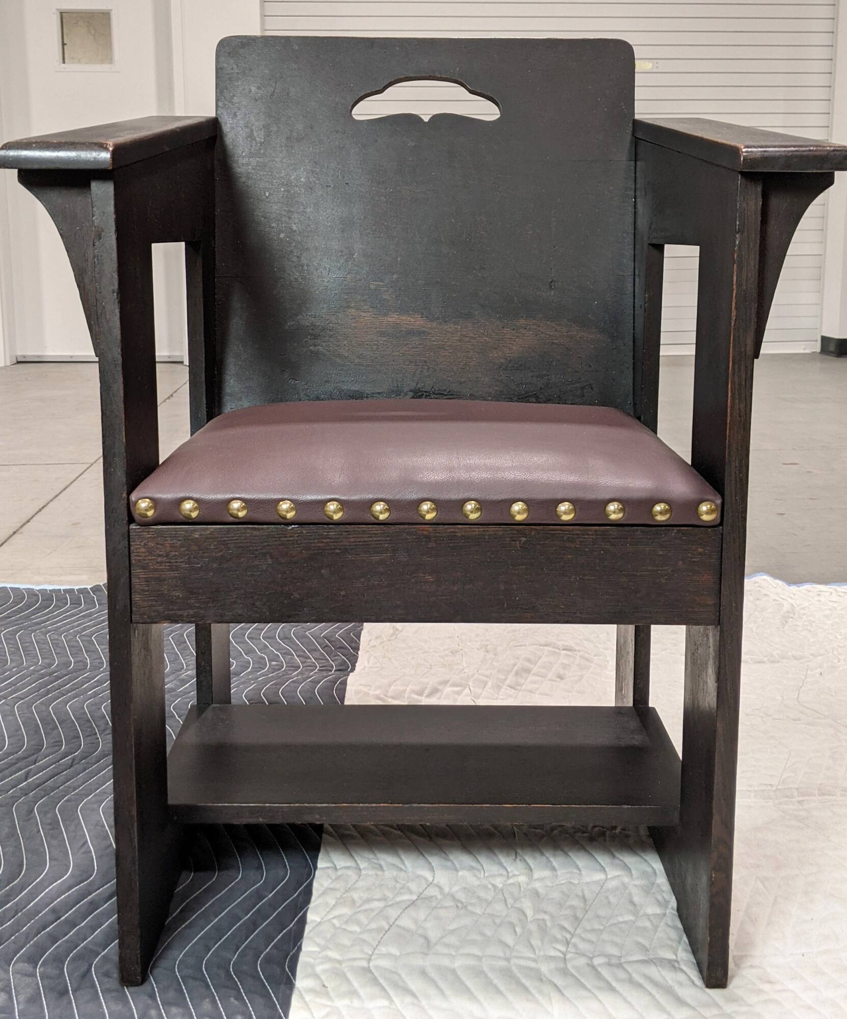 DescriptionThe Limbert café chair, model No. 500 is constructed of quarter sawn oak with square cut out sides and high slanted arms supported by corbels at the front legs. The upper portion of the solid backrest has a small cut out in the shape of a lotus leaf (?) which can be used as a handle. A large wide horizontal stretcher bar spans between the two sides and rest on the bottom edge of the lower cut out.Gallery LabelOne of the most important American Arts and Crafts furniture makers of the early 20th century, Charles P. Limbert produced distinctive designs based on contemporary Scottish and European models. Embracing Arts and Crafts principles of functional design, honesty of materials and spare use of decoration, Limbert created elegant, reductive works. A scalloped, crescent-shaped cutout in the back is the only ornament in the simple form of this chair, composed of a broad back, wide arm rests and arm supports and a low stretcher. Like many of his contemporaries, Limbert advocated the superiority of handmade objects, although machines were used in the production of these minimal and unpretentious works.