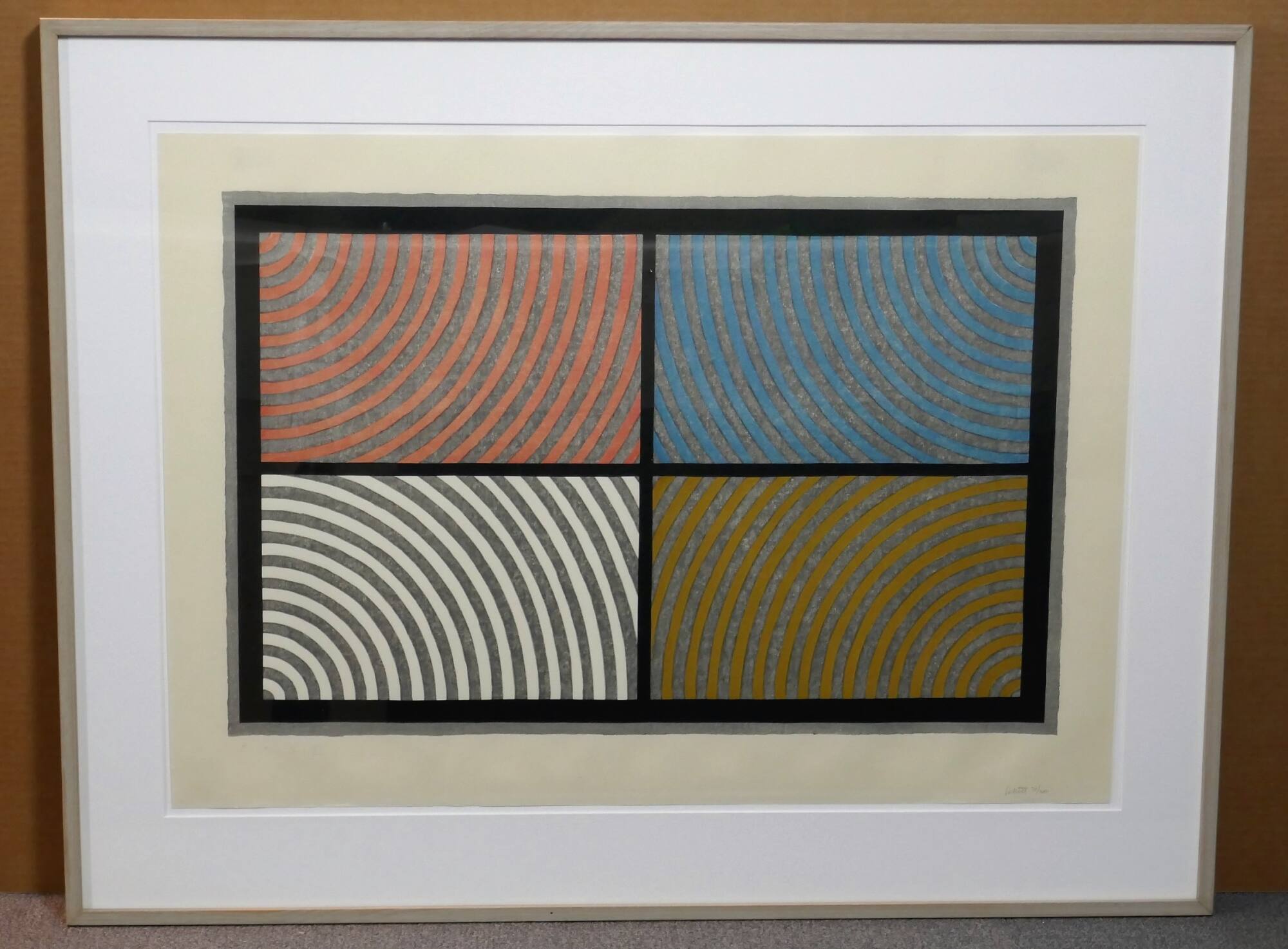 DescriptionThis print is divided into four equal rectangular sections, which contain radiating patterns of concentric lines that spread from the outer corner, inward toward the center of the composition. One quadrant is red/gray, blue/gray, white/gray, yellow gray, and each quadrant is framed and separated by solid black.Gallery LabelThis print is comprised of four equal, rectangular sections that are framed by solid black lines. Each section contains a radiating pattern of concentric arcs that spread inward toward the center of the composition. The color patterns of the quadrants