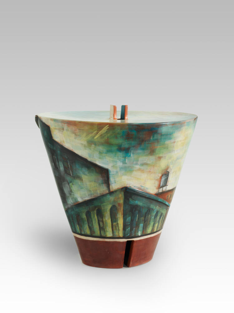 DescriptionA cone-shaped vessel with a flared opening on top, and an addition envelope opening on one side. Allover painted with a scene of muted toned apartment buildings and warehouse buildings. A grey water tower on one side is set against a blue sky — transparent white accents overall in short, visible square strokes.Copyright© Lidya Buzio
