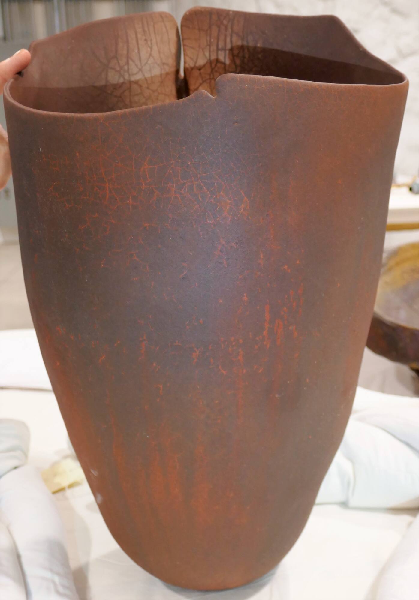 DescriptionA tall thin-walled pinkish-brown mottled sack-like form with an uneven top edge. One side splits causing some waving in the wall of the form with a pinched indentation.Copyright© Estate of Richard DeVore