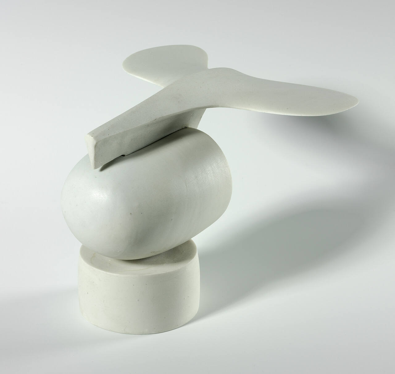 DescriptionSmall, white porcelain sculpture with circular base, upon which rests a solid demi-ellipsoid, capped by an element reminiscent of a bifurcated whale's tail.Copyright© Thea Burger Associates, Inc