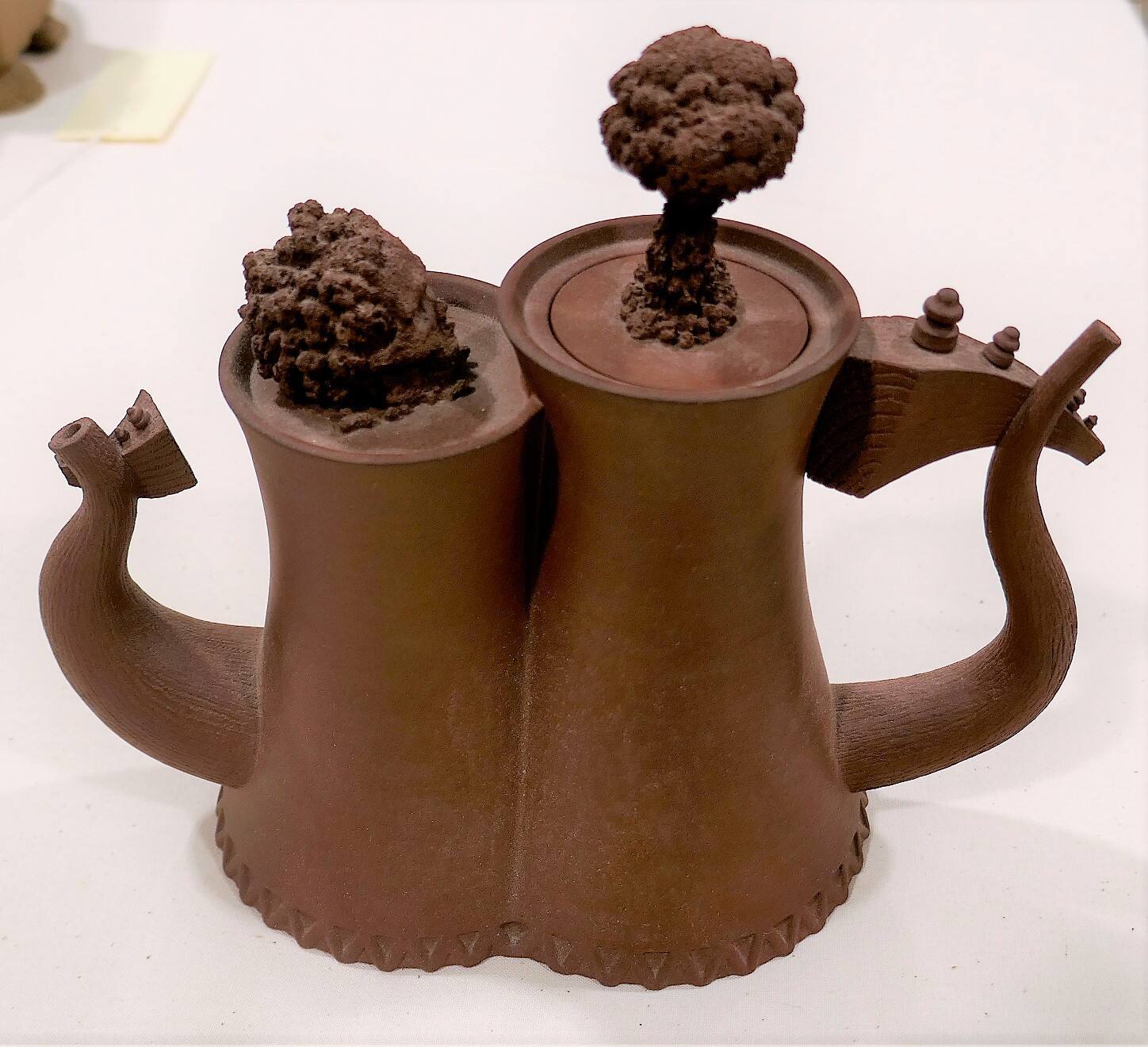 DescriptionAn unglazed red-brown stone clay teapot in the form of a double cooling tower. The lids are topped with atomic bomb mushroom clouds. The spout and handle are serpentine-like. Impressed zig-zags band around the base of the pot.Copyright© Richard T. Notkin