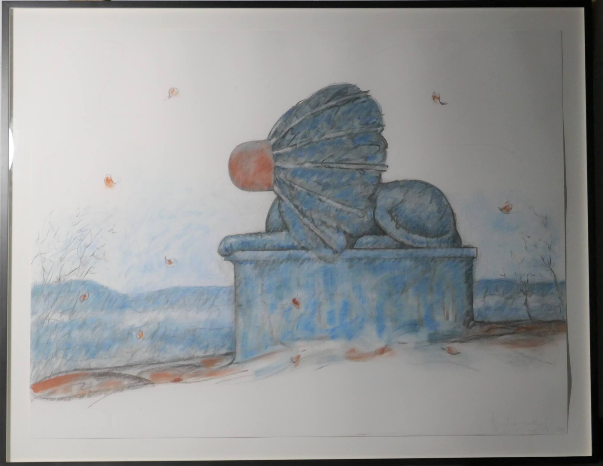DescriptionThis drawing depicts a sphinx whose head has been replaced by a shuttlecock. The sphinx reclines on a large base. The drawing is executed primarily in blue with the tip or head of the sphinx in orange. Landscape as background is also in blue with small orange falling leaves.ProvenancePurchased from the artists;