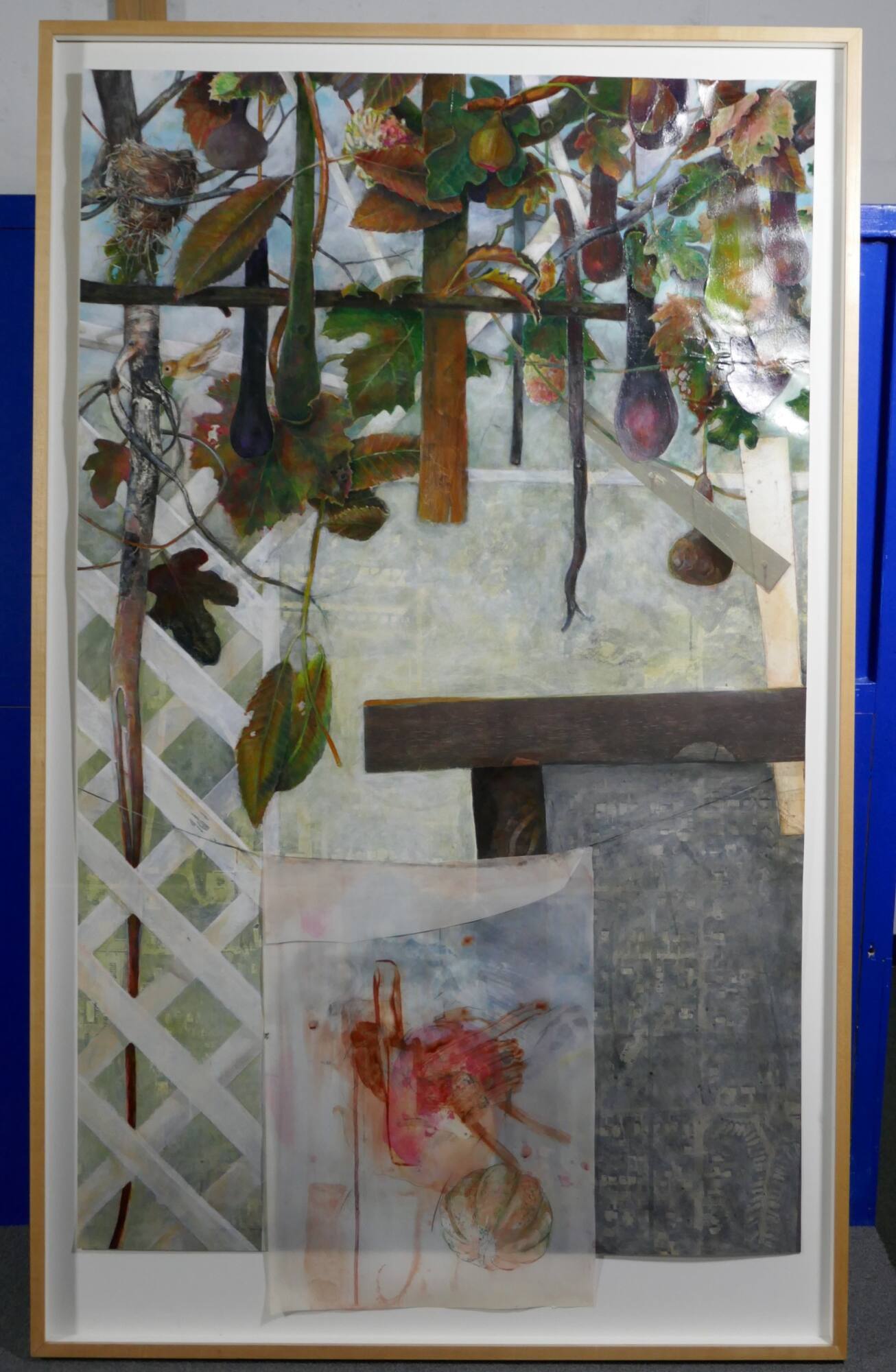 DescriptionThis work depicts fruit and foliage along the top edge of the composition with a trellis running from the top to bottom along the left edge. To the lower right, is a T-shape suggesting the structure of a clothesline and there appears to be a piece of delicate cloth hanging from the line at the lower bottom edge. Many of the forms are superimposed on a map.ProvenanceWith Dennis Morgan Gallery, by 2003.
