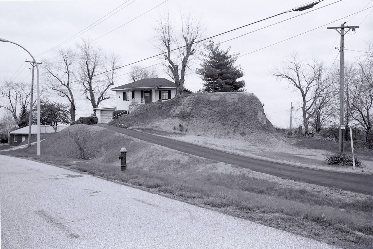 DescriptionRemains of mound in residential area; fire hydrant in center left; skid mark in road in lower left corner.