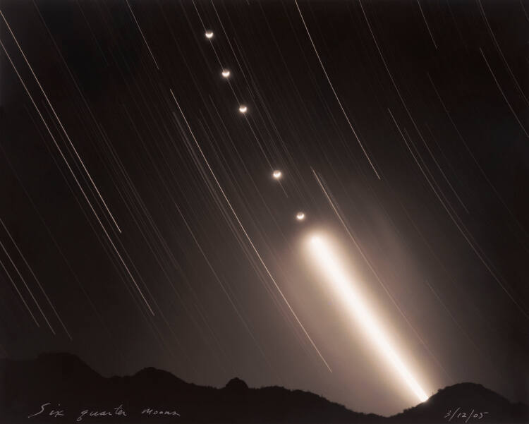 DescriptionLengthy exposure of star trails and rising moon over distant mountain range; very bright trail of moon in the lower half of its path, with 5 individual images of it in upper half of its trail.Exhibition HistoryHeavens: Photographs of the Sky & Cosmos. The Nelson-Atkins Museum of Art, Kansas City, MO, June 15 - November 13, 2011, no cat.