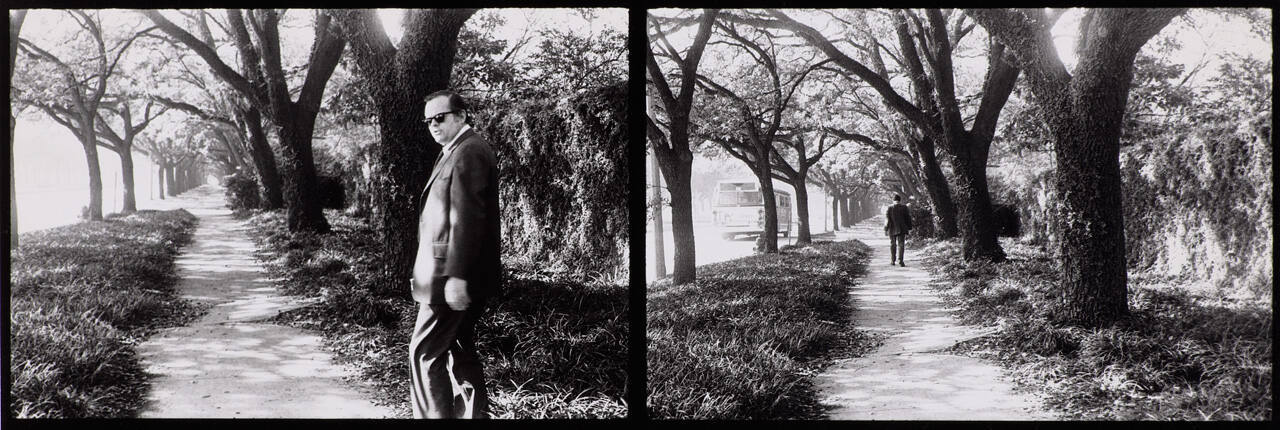 DescriptionDouble frame image looking down a tree-lined sidewalk. In the first frame, a man wearing a suit and sunglasses looks back towards the viewer. In second frame, the man is half-way down the path, walking away from viewer.Copyright© Eve Sonneman