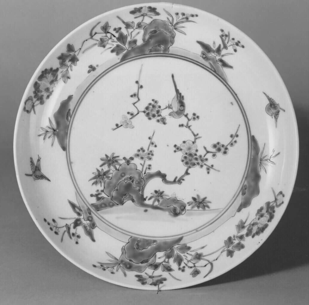 DescriptionShallow dish decorated with rocks, flowers, and birds. Central roundel of double underglaze blue lines, decorated with green, blue, and iron-red cock's comb-shaped rocks with plum branch in blue, blossoms in red and long-tailed bird; two major decorative friezes in cavetto of rocks, birds, flowers, and earthen banks in overglaze enamels; reverse decorated in running scrolls terminating in six, evenly spaced flower and tendril scrolls.ProvenanceWith K. Imai, Kyoto, Japan, by April 20, 1968;