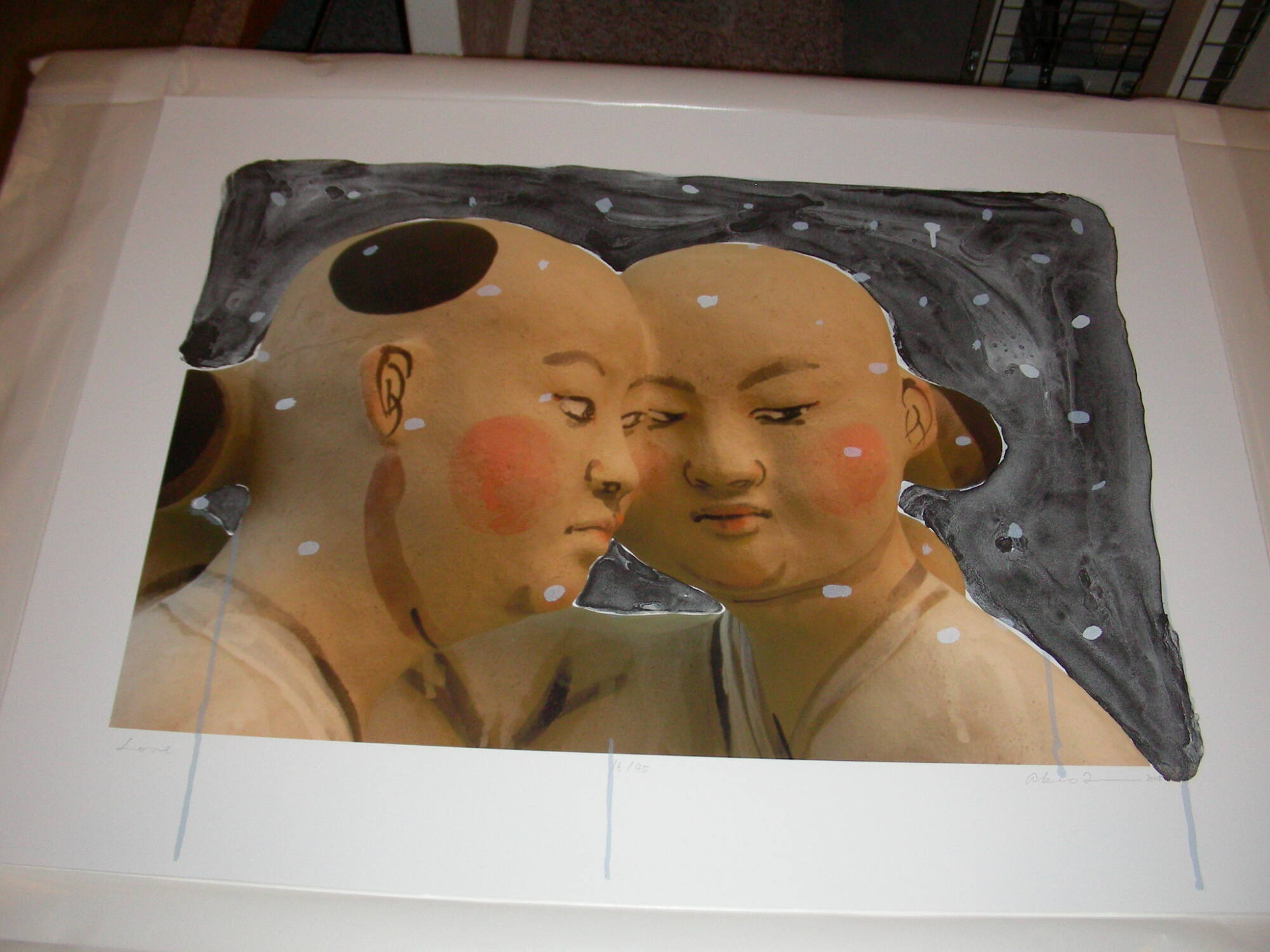 Description2 Asian figures from shoulder to shoulder, foreheads touching, in front of black backgroundCopyright© Lawrence Lithography, Kansas City, MO