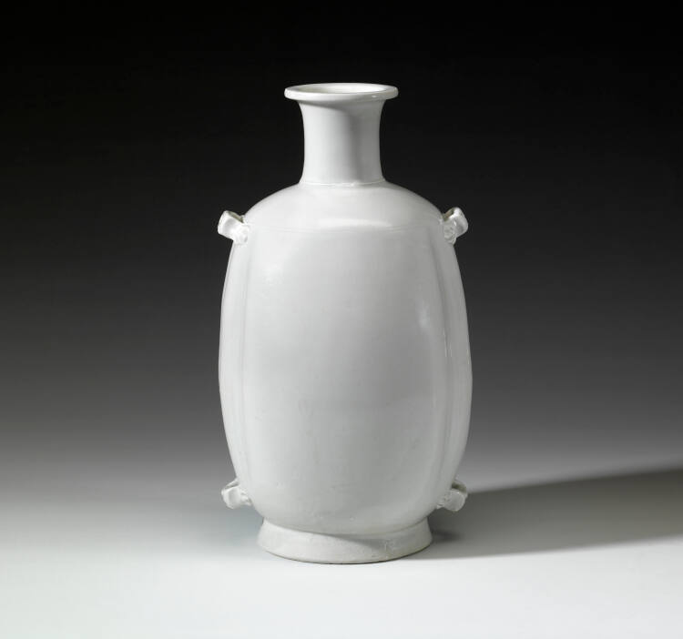 DescriptionThe bottle vase possesses an ovoid lobed body, short straight foot-ring and narrow cylindrical neck with flaring mouth. Twin small lug handles are applied to the shoulder and lower body. The chalky white body is covered in a transparent glaze of bluish tone.Exhibition HistoryKunst Industri Copenhagen, 1950 Mostra d'Arte Cinese, Palazzo Ducale, Venice, 1954.