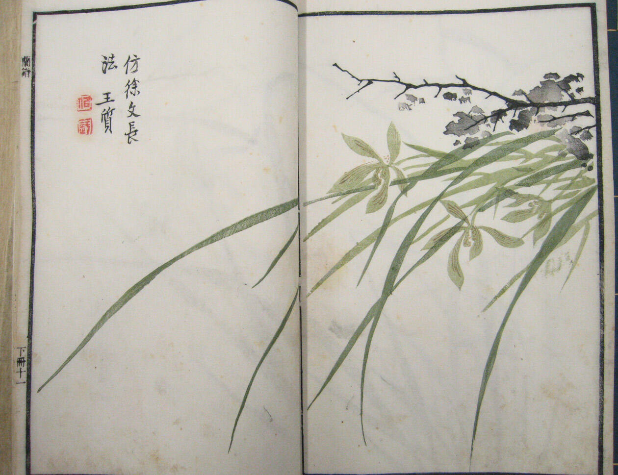 The printmakers painstakingly carved the slender forms into woodblocks to resemble the calligraphic brushstroke as it would appear in painting. Each print bears an inscription, stating that it is designed after the style of a Ming dynasty painter. The attributions show how eager the manuals' publishers were to make a connection to the painting tradition.