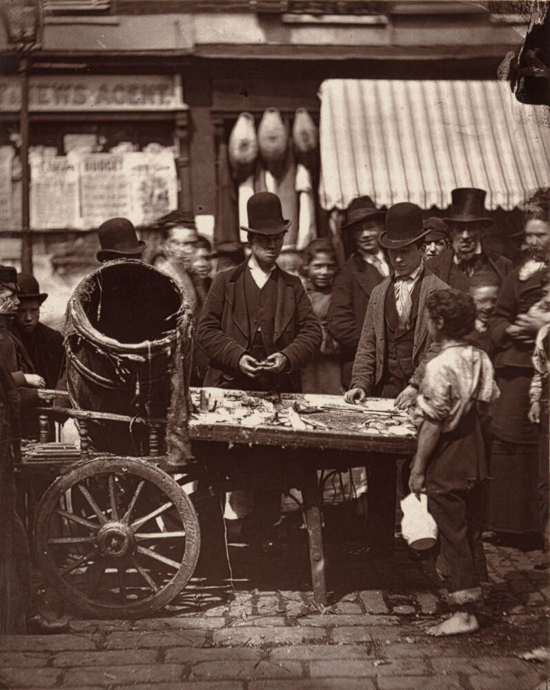 DescriptionImage of an outdoor market scene. A young boy holding a pitcher in one hand is in the foreground on right side of frame and faces a crowd that has gathered near a wheeled cart filled with fish.Gallery LabelConsidered one of the first uses of documentary photography to bring attention to social concerns, the book Street Life in London (1876–1877) includes photographs by John Thomson and text by journalist Adolphe Smith. Thomson’s portraits lent a degree of authenticity to Smith’s writing. This photograph derives from that important project.