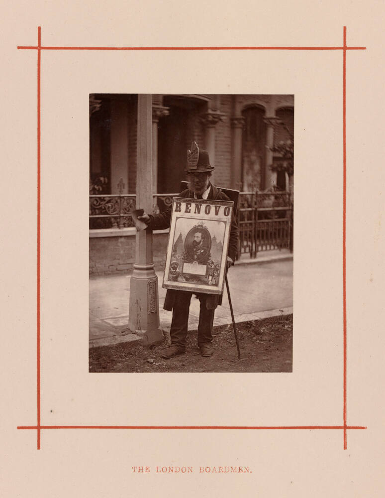 DescriptionView of sign-board man, with cane and with pamphlet in outstretched hand, standing in street beside a lamp post; his sign promotes “Renovo.”Gallery LabelThis street portrait depicts a man wearing a sandwich board advertising Renovo, a product used to restore gloves. Published in John Thomson’s Street Life in London, the photograph is one of many in this series that highlights the plight of working-class and impoverished Londoners during the 1870s. Thomson’s work is an important early example of social documentary photography, following pre-photographic journalistic precedents that called attention to class inequities.