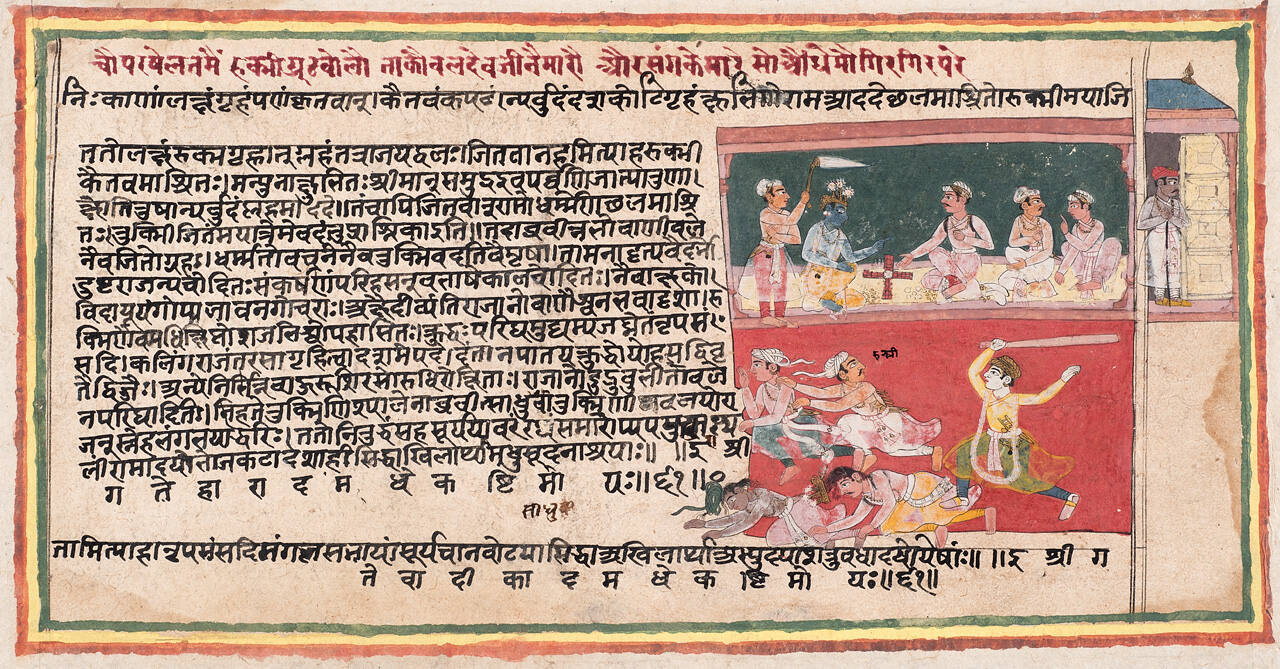 DescriptionThis is a rectangular, horizontally formatted manuscript folio on paper with a text block and painted scene on both the recto and verso. The paintings are small, square compositions featuring figural groups within architectural settings. The paintings utilize bold hues: reds, blues and greens, in flat color fields. The scenes depict gods, humans, and asuras (demons), illustrating events from the Bhagavata Purana. In the recto, an architectural window projects from the upper right corner of the painting while figures running from a man with a sword tumble out of the composition in the lower left corner. The verso features the demon Banasura approaching the gods Siva and Parvati. Interestingly, Siva has a projecting left eye. The text block lies to the left of the painted illustrations in this folio and contains writing in Devanagari script in thick black ink with red notations used for chapter headings.Exhibition History