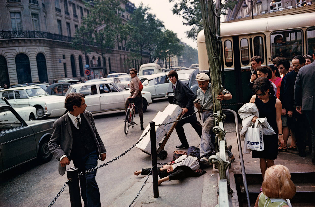 In this unsettling yet curious scene, a man lies sprawled on the ground as passersby, including one with a hammer in his hand, step around him. The photograph itself offers no explanation of the event’s cause or seriousness. Joel Meyerowitz was an early proponent of this non-narrative style of street photography. He embraced the spontaneity and relative anonymity enabled by the handheld 35 mm camera format.