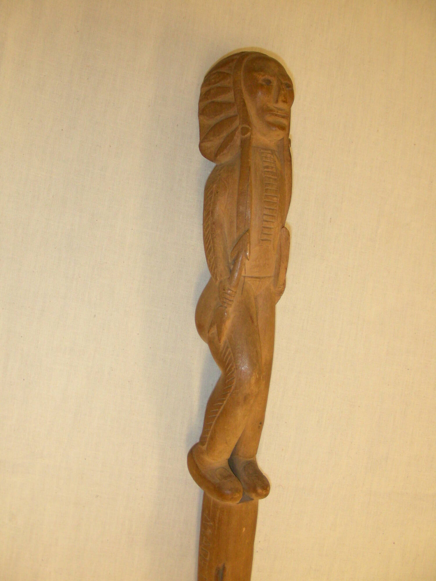 DescriptionCarved wooden cane with a carved handle in the shape of an Indian man with headdress holding a bow and arrow, a snake curled around the shaft and a turtle, and a tomahawk.CopyrightThis work is copyrighted. Contact the copyright holder for permission to reproduce.