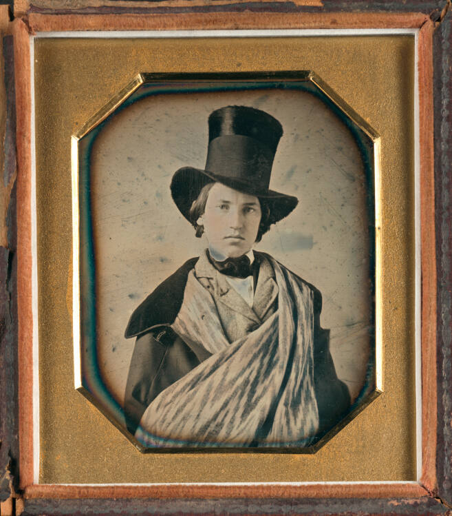 DescriptionImage of young man in beaver fur top hat wearing a shawl/cape around his shoulders; hand-tinted cheeks. Half leather case-plain; early mat