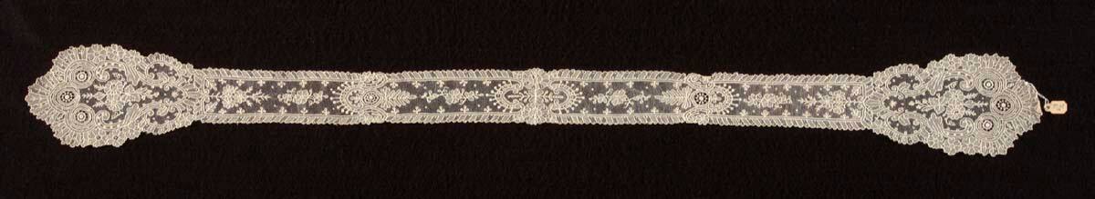 DescriptionNeedle lace of the point de gaze type. Straight center band swelling into oval ends. The edges outlined with stylized leaves-along the band-and flower heads-around the ends. Delicate floral sprigs are framed by S and C scrolls.ProvenanceVirginia Eaton George (1889-1975), Kansas City, MO, by 1937;