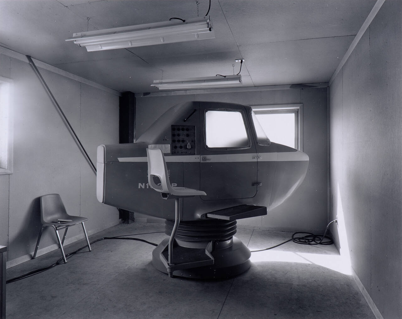 DescriptionImage of an airplane simulator in the center of a small room with a chair against the wall; flourescent lights overhead.Gallery LabelThis spare, functional space served as a classroom to teach pilots how to fly. The interior attempts to simulate flying using a model cockpit that is far removed from the experience of maneuvering a massive plane, engines whirring, through the sky.