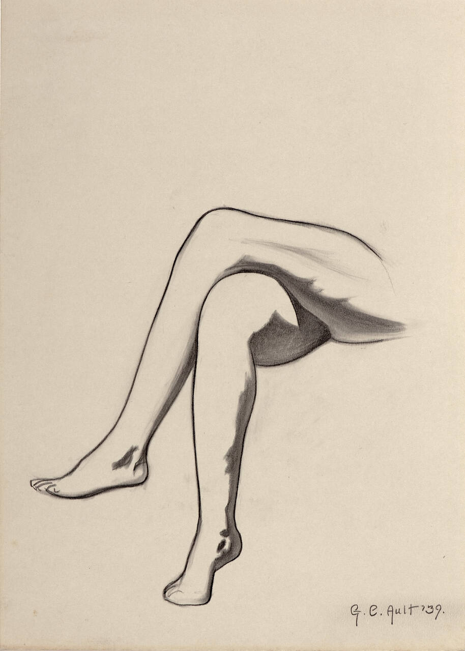 Rather than filling this sheet, Ault situated the isolated legs within ample blank space. Defined with a continuous and uniformly bold outline even where light hits them most strongly, these legs suggest the neatly crossed, perpetually immobile limbs of a mannequin. The fragmentary nature and clinical approach to the disembodied body parts move them into the realm of the surreal.