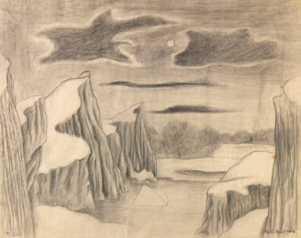 This aptly titled drawing does not depict an identifiable landscape. Rather, it presents a dreamscape or a place visited in journeys of the subconscious. To give the unseen visual form, Ault multiplied the looming, snow-capped geological monument from an earlier, equally surreal drawing that hangs nearby. The march of these strange, striated formations at either side of the composition amplifies the effect of recession into this nocturnal landscape accented with spectral clouds.