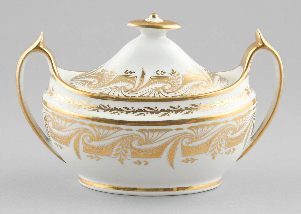 DescriptionOval sugar bowl, with lid, of white porcelain decorated with wide border of gilt, and continuous leaf pattern around top; two handles of gilt. Lid has single border of gilt in formal design, and continuous leaf pattern.Provenance