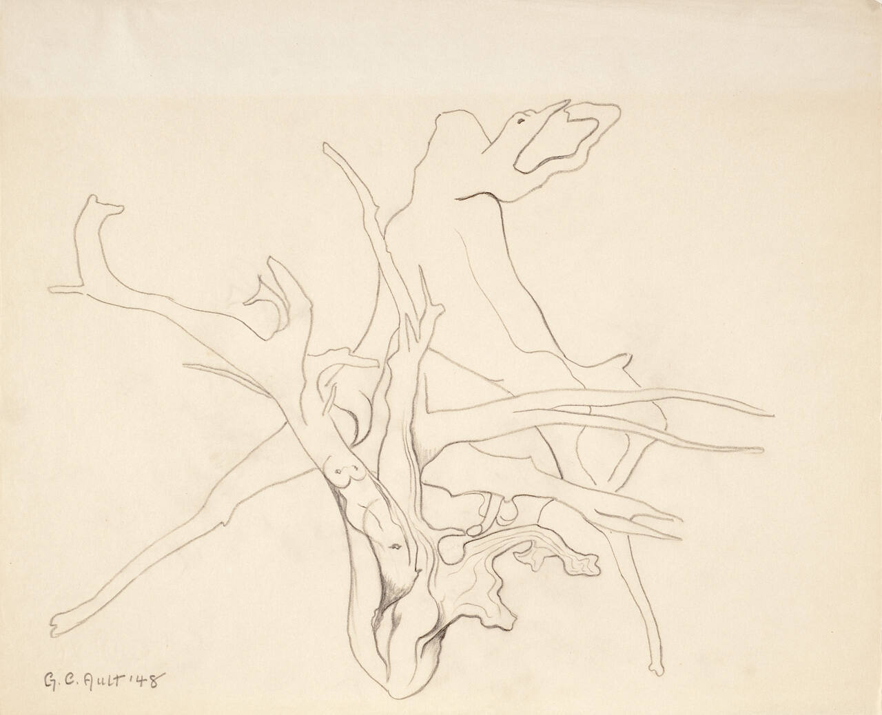 DescriptionAbstract, biomorphic forms suggestive of tree branches and roots with female torso within a form left of center.