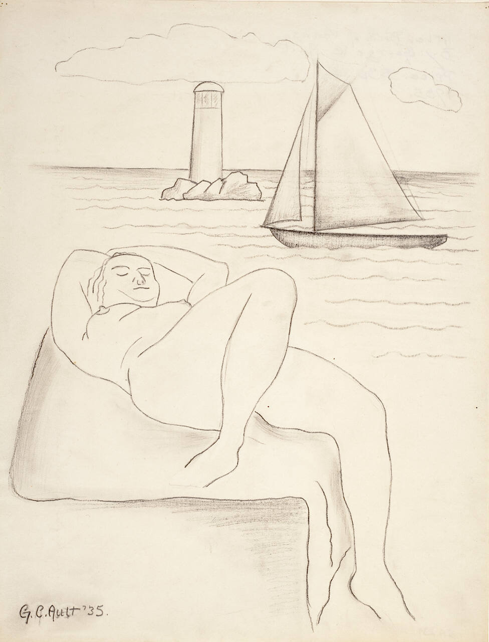 According to ancient Roman myth, the goddess Venus was born from foam that resulted after her castrated father’s genitals were thrown into the sea. Ault took artistic license with this dramatic story and depicted his goddess of love as a foreshortened sunbather peacefully lounging while a sail boat glides past a lighthouse in the distance. By titling the drawing Birth of Venus, Ault—perhaps with tongue-in-cheek—participated in the centuries-old tradition of using classical mythology to cloak the representation of the female nude in respectability.