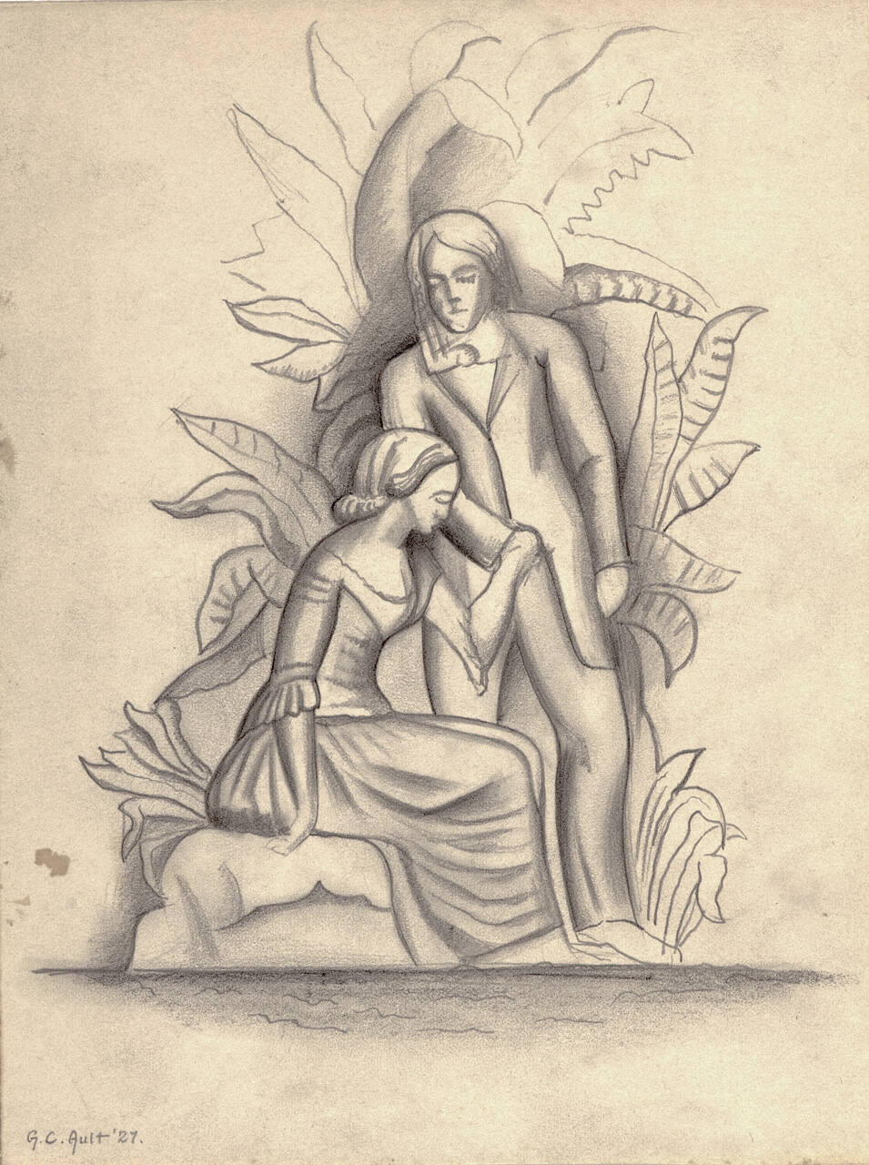 DescriptionContour line drawing with minimal shading of man and woman in front of tall leafy foliage: Woman wearing a long dress seated on rock is to the left of man in suit; her raised proper left hand holds his proper right hand; her right hand is dropped at her sideGallery Label