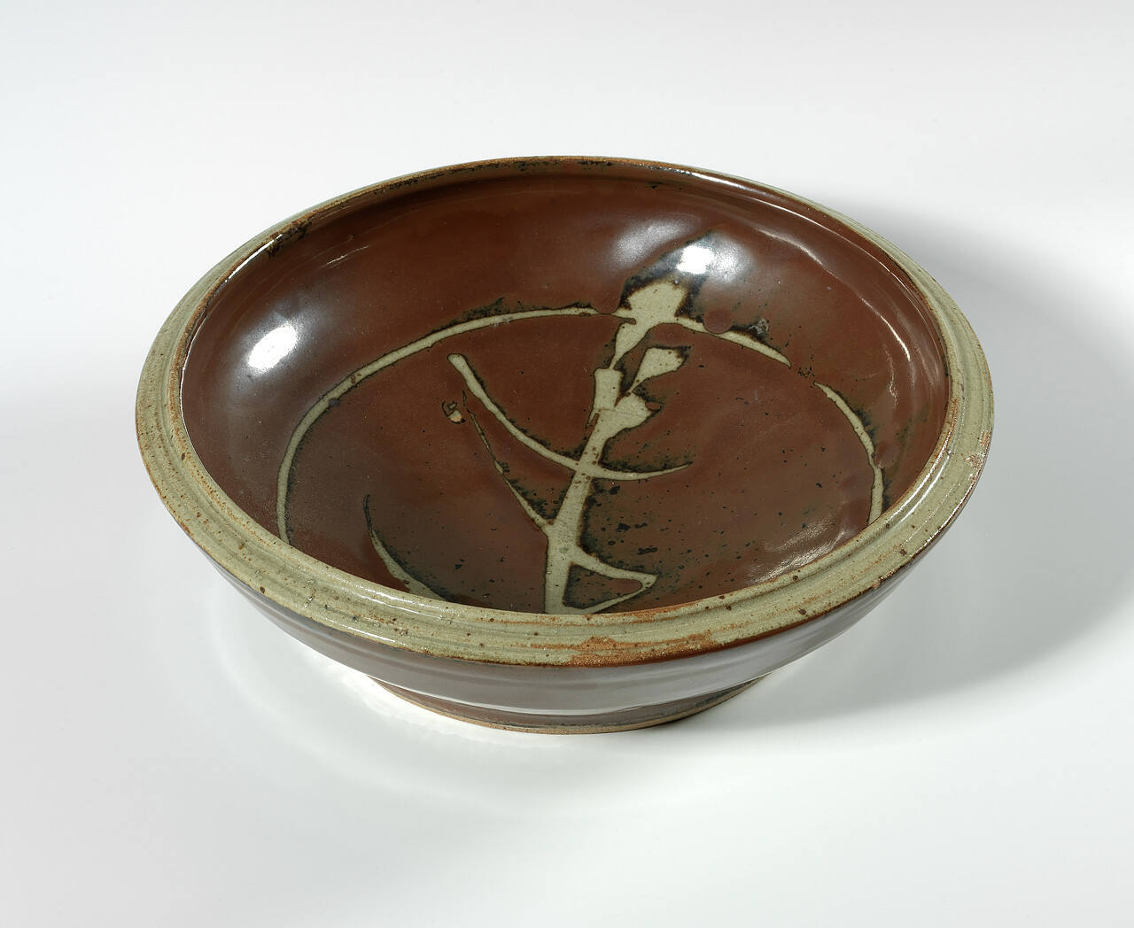 DescriptionCircular wheel-thrown stoneware deep plate with glazed decoration of abstracted grass in the well.Copyright© Shōji Hamada Estate