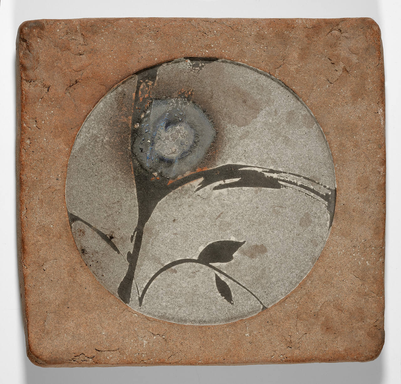 DescriptionStoneware slab plate with circular depression in the center with glazed in grey and decorated with abstracted foliage in black, blue and red.Gallery LabelThis slab combines a glazed and unglazed form with simple, naturalistic decoration. David Shaner’s minimalist shape of a square with a circle mimics painting and sculpture from the 1960s and 1970s. He also refers to traditional ceramics in its decoration. The lines with leaves are based on Shoji Hamada’s spontaneous design of grasses.