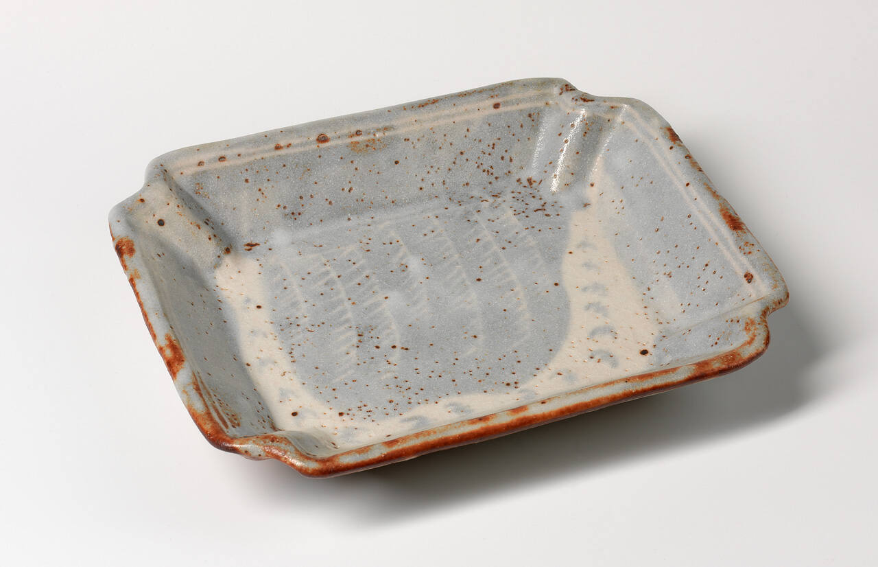 DescriptionShallow, square dish with slightly flared rim completely glazed with Shino glaze. The well of the dish decorated with a flock of birds flying (grey against white) above grasses painted white against the grey ground.