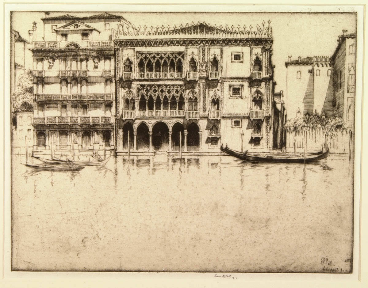 Gallery LabelIn contrast to Joseph Pennell, who celebrated modern American architecture with etchings like The Woolworth—Through the Arch, Ernest David Roth looked to older European scenes. This etching depicts a renowned 600-year-old palazzo on the Grand Canal in Venice, Italy, known as the Golden House.