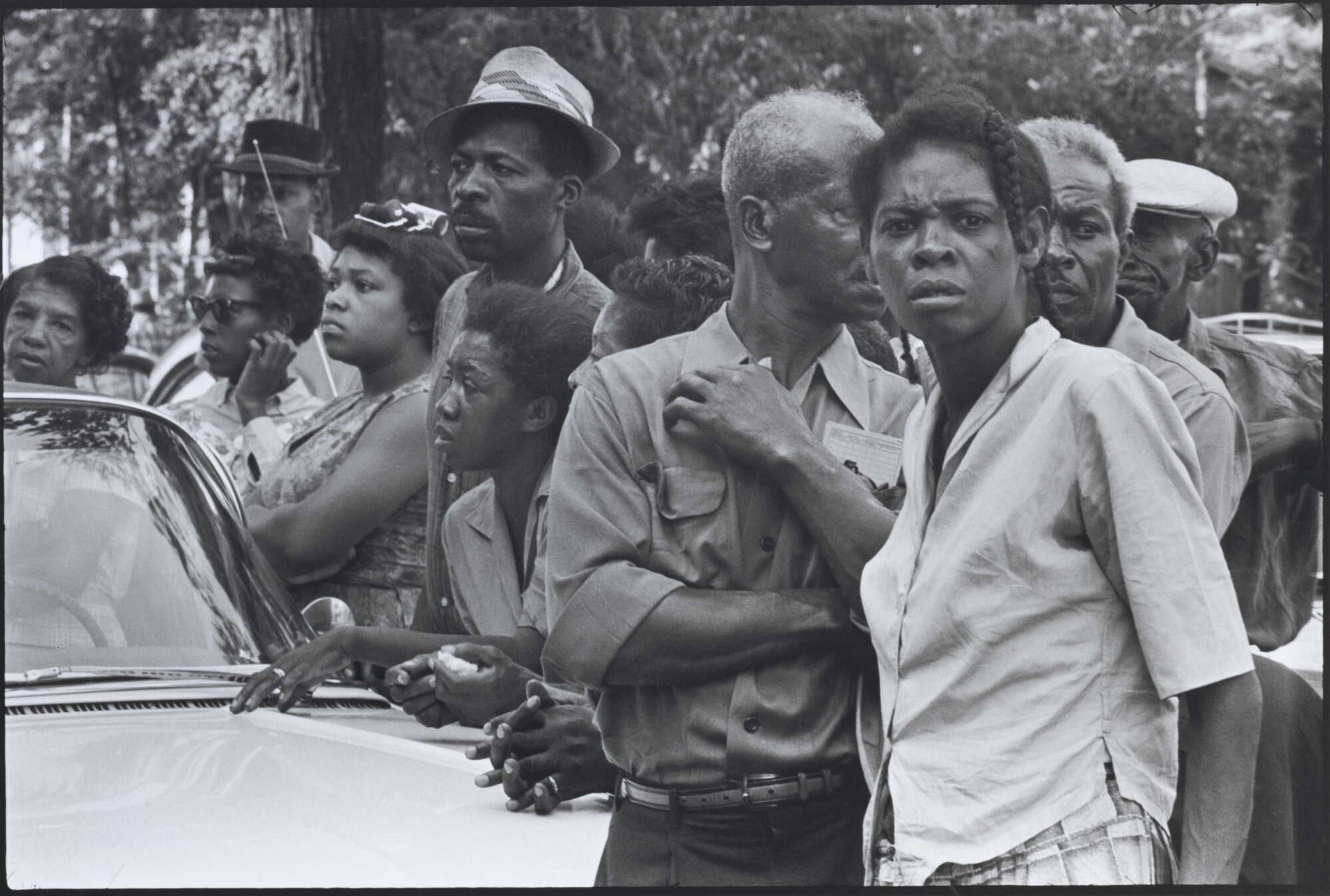 DescriptionGroup of black men and women gathered around a car. Woman with concerned expression in foreground, right.Copyright© Danny Lyon