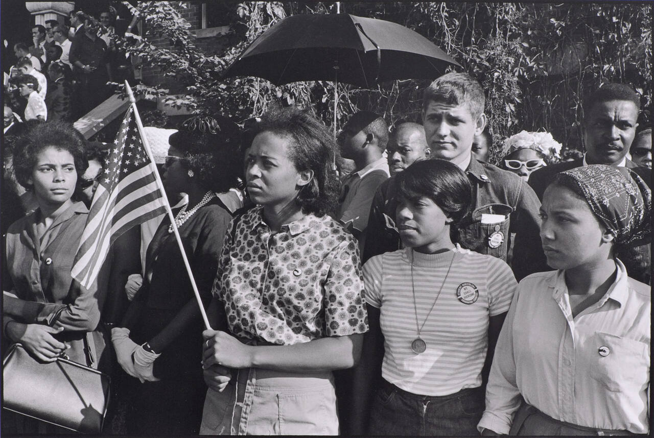 DescriptionGroup of people standing outsdie; woman in front holds an American flag.Copyright© Danny Lyon