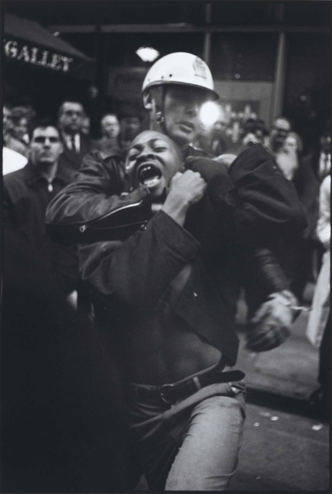 DescriptionWhite police officer with arm around throat of young black man (Taylor Washington).Copyright© Danny Lyon