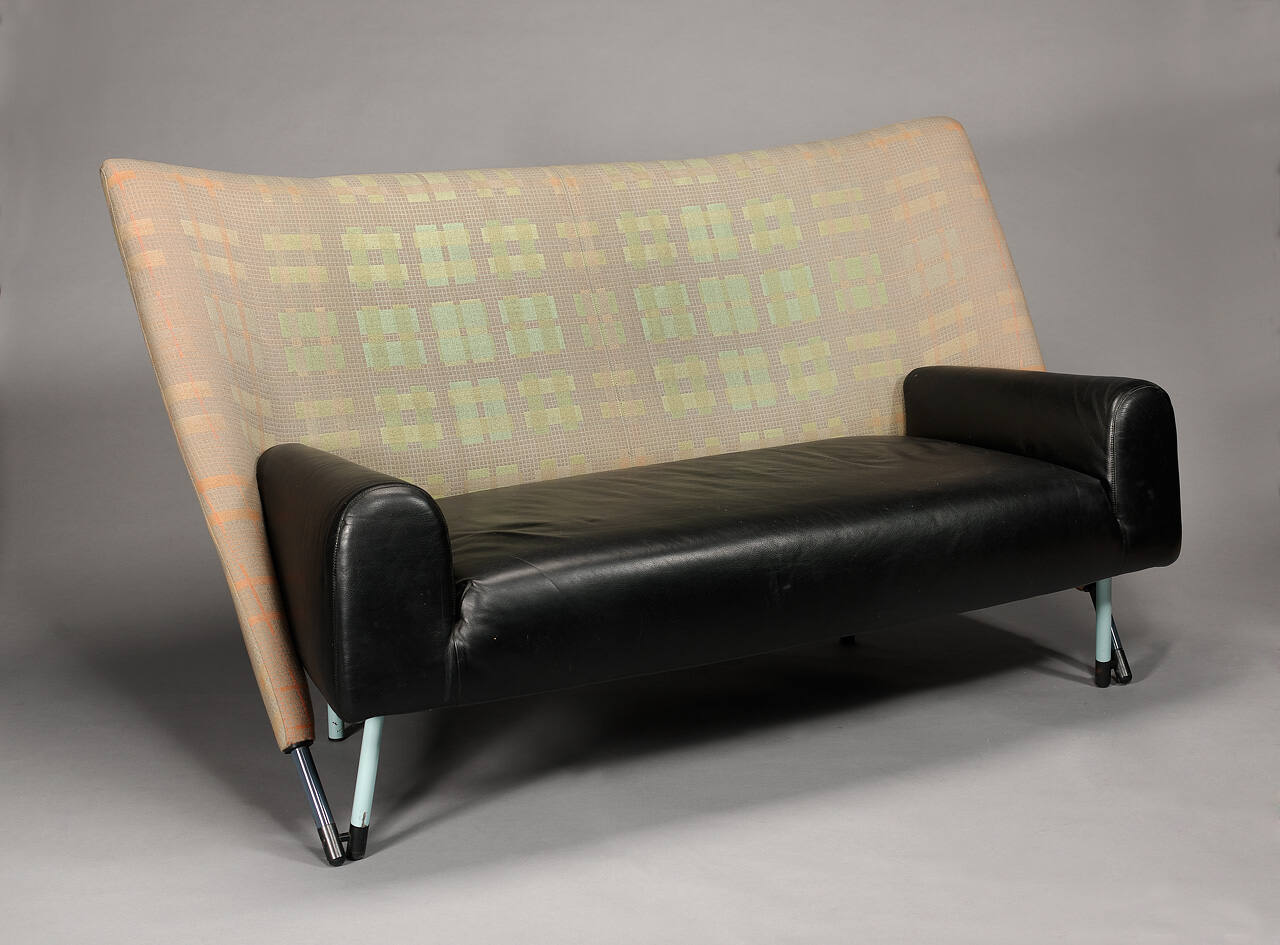 DescriptionSettee: large seating furniture with angled back, upholstered in window-pane plaid in muted greens and oranges. The seat and low armrests upholstered in black leather, supported by tubular metal feet capped with black plastic.CopyrightThis work is copyrighted. Contact the copyright holder for permission to reproduce.